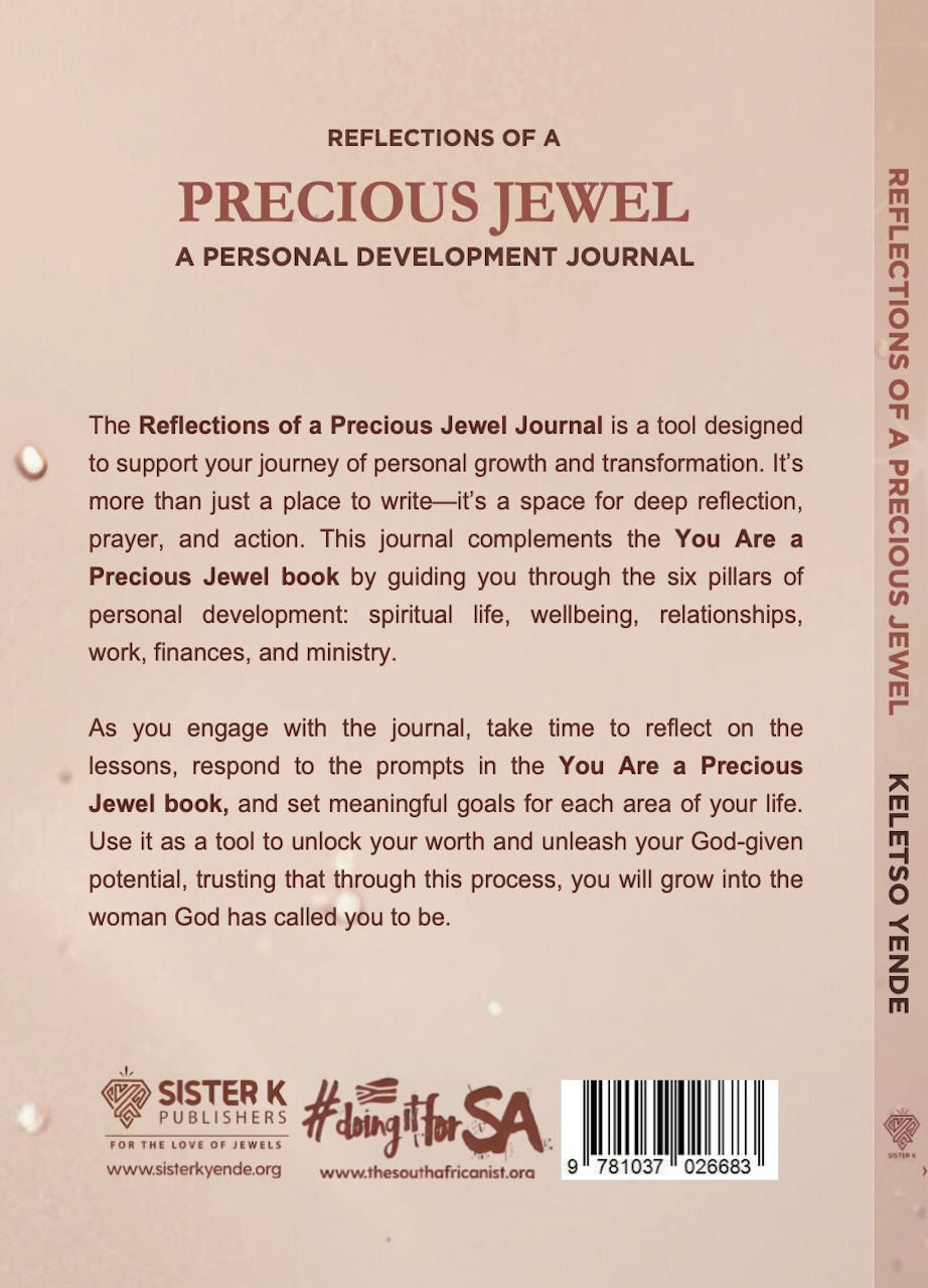 The Reflections of a Precious Jewel Journal is a transformative personal development tool designed for women seeking growth, purpose, and spiritual alignment. More than just a writing space, this journal offers guided reflection, prayer prompts, and actionable exercises across six key areas: Spiritual Life, Wellbeing, Relationships, Work, Finances, and Ministry. Perfect for readers of “You Are a Precious Jewel,” it offers a structured approach to self-discovery and personal transformation.